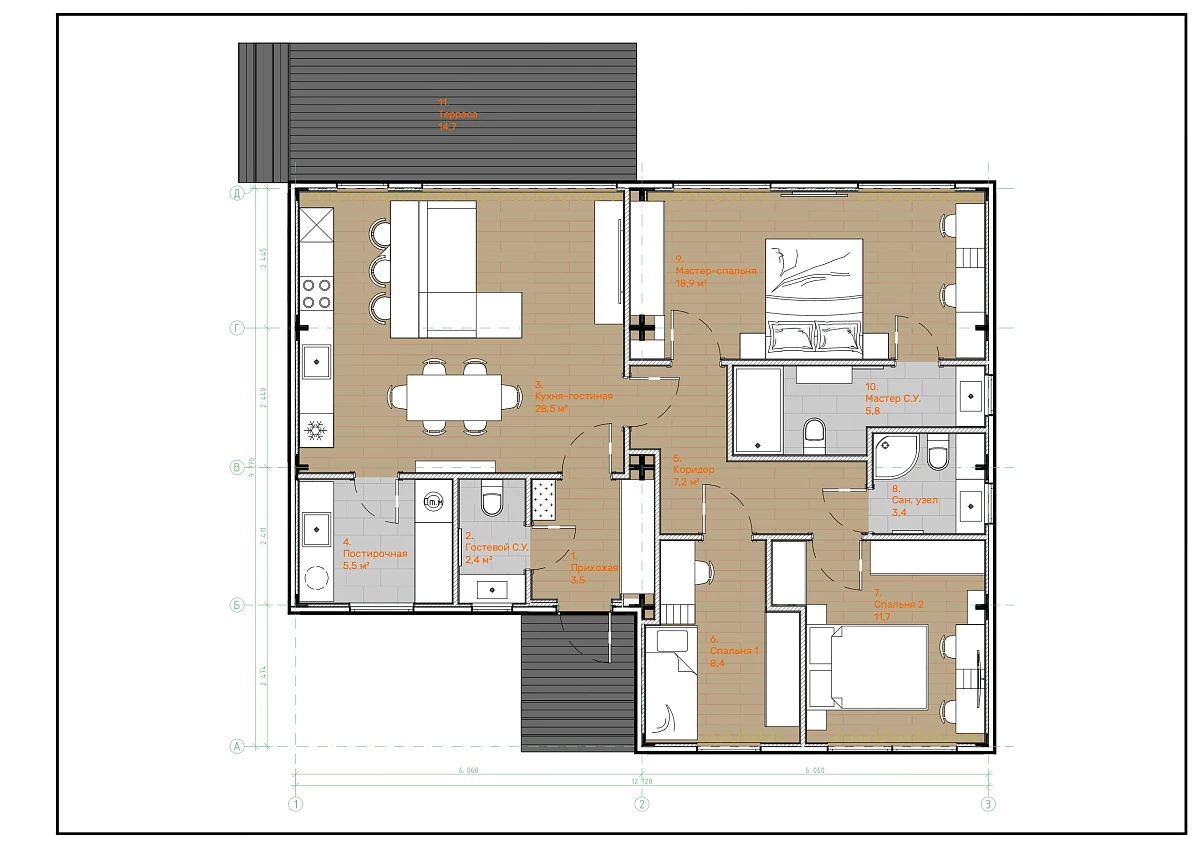 Домокомплект DOORHAN 133 ПРО — это полноценный дом для большой семьи и нескольких поколений. Мастер-спальня с собственным санузлом формирует отдельный приватный блок для родителей. Две дополнительные спальни позволяют удобно разместить детей, родственников или организовать рабочий кабинет. Пространство дома рассчитано на долгосрочное проживание и разные сценарии жизни семьи.